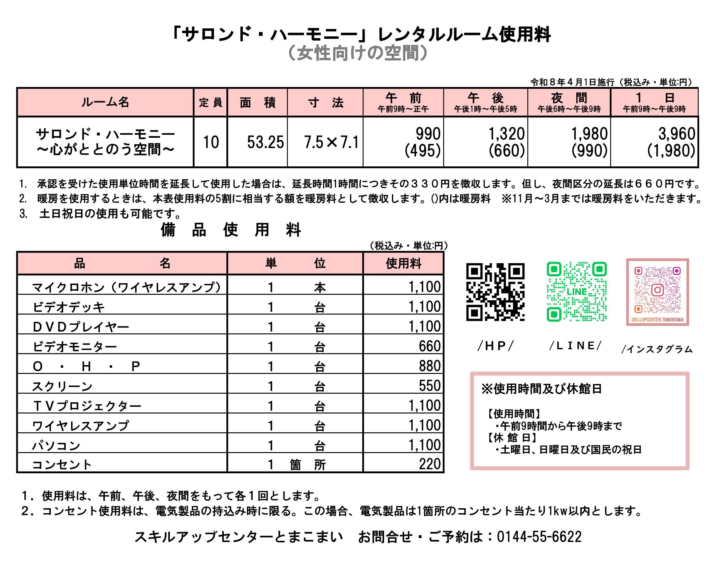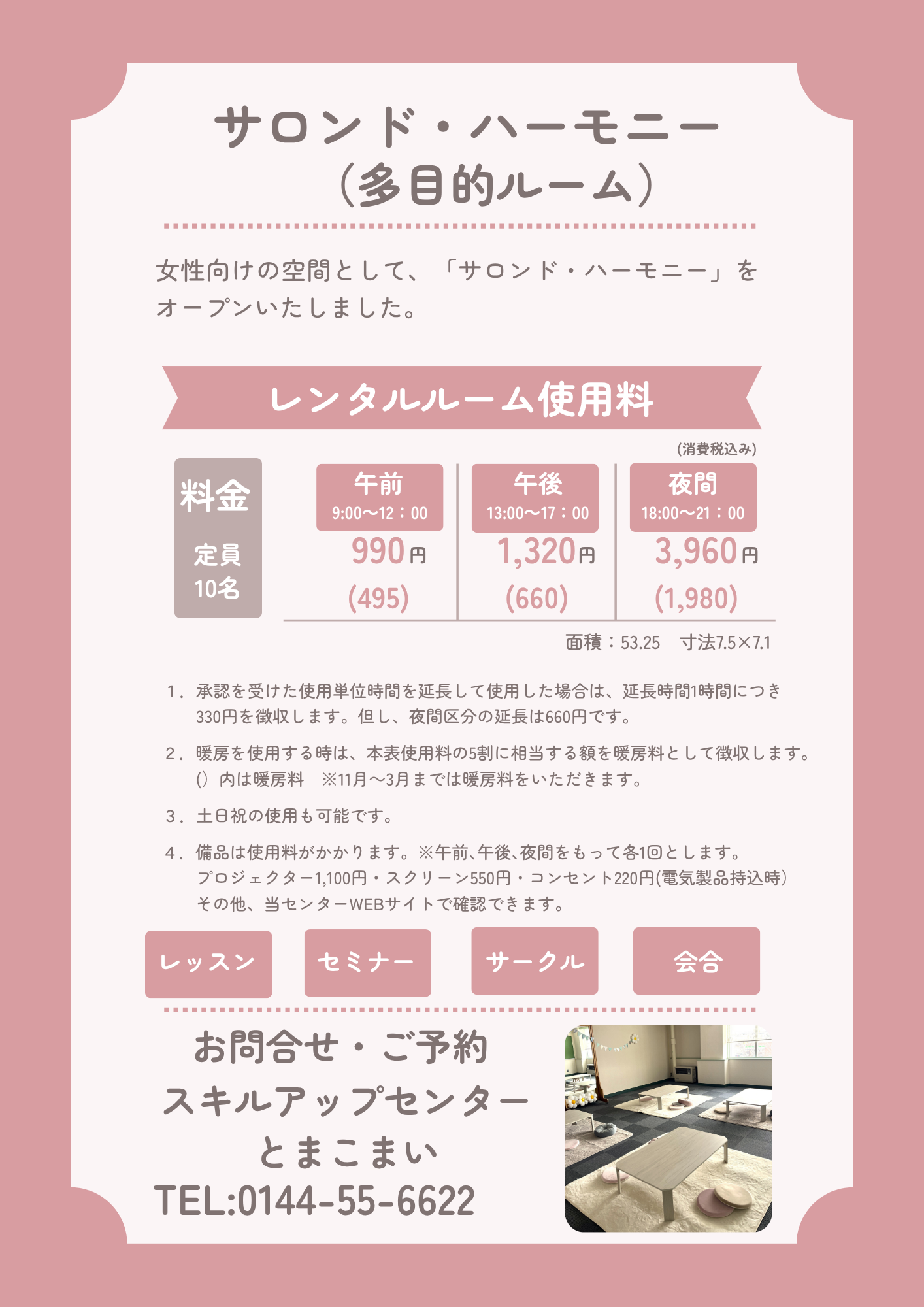 2026年4月より、各種レッスン・セミナー・サークル・会合などにご利用いただける女性向け多目的レンタルスペース「サロンドハーモニー」の利用・申込み受付を開始しました。